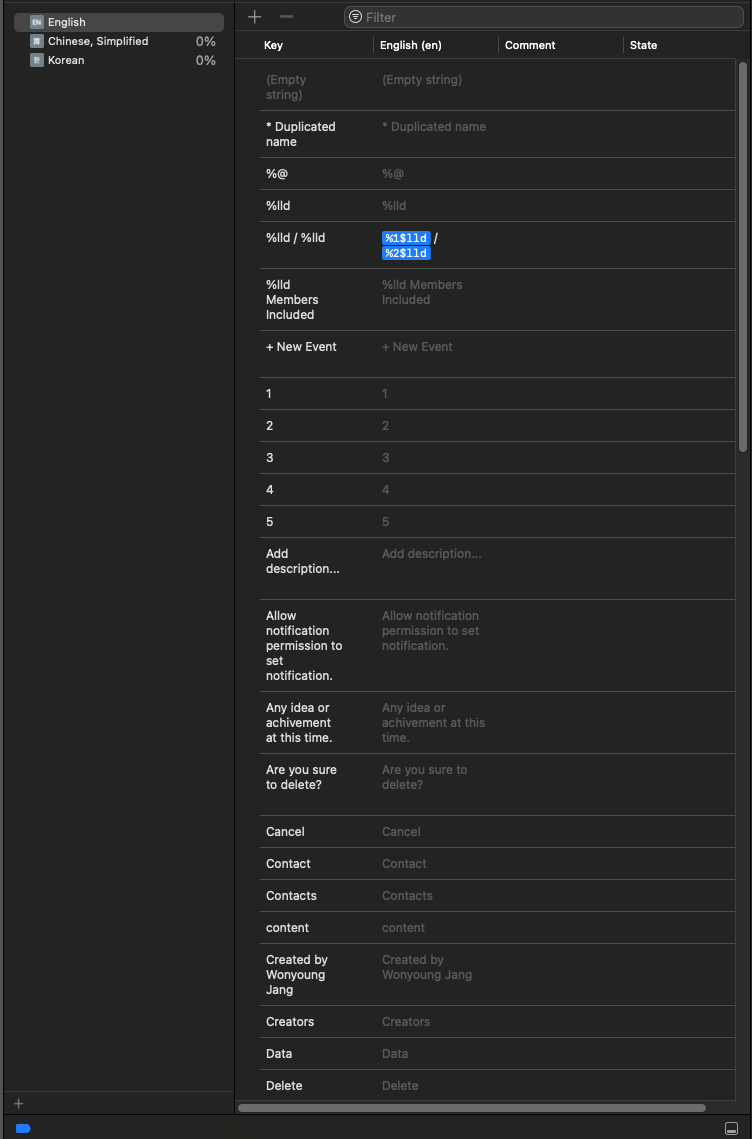 그럼 상단에 Source code, String catalog 라는 두개의 탭이 보일텐데 String catalog로 파일을 열어주면 아까 처음에 본 화면이 나오게 될 것이다.