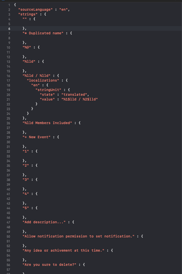 앗 만약 파일을 열었는데 아무것도 없다면? 걱정하지 말자 빌드 한번만 해주면 Text("") 혹은 Label("")등에 있는 모든 텍스트를 인식해 다음과 같이 파일을 수정해준다.