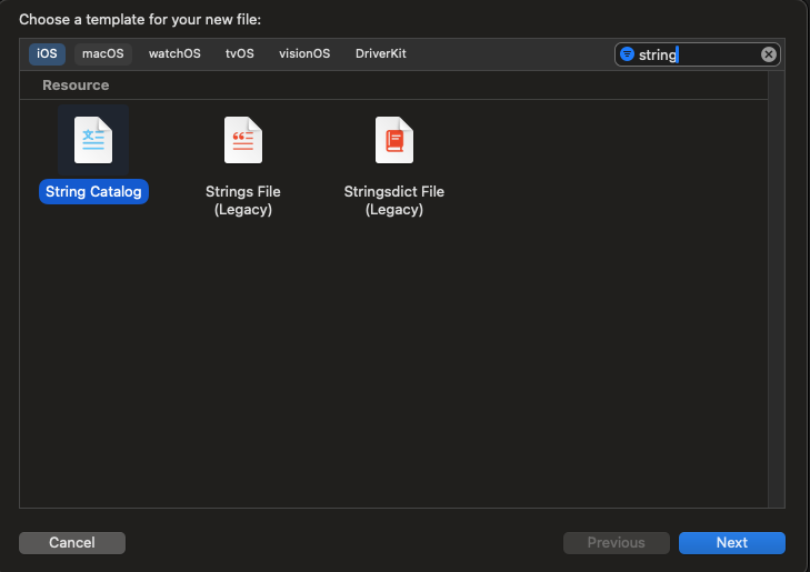 그리고 검색창에 'string'을 검색하면 저렇게 3개의 아이템이 나올텐데, 가장 첫번째에 있는 String catalog를 선택하고 Next를 눌러주자